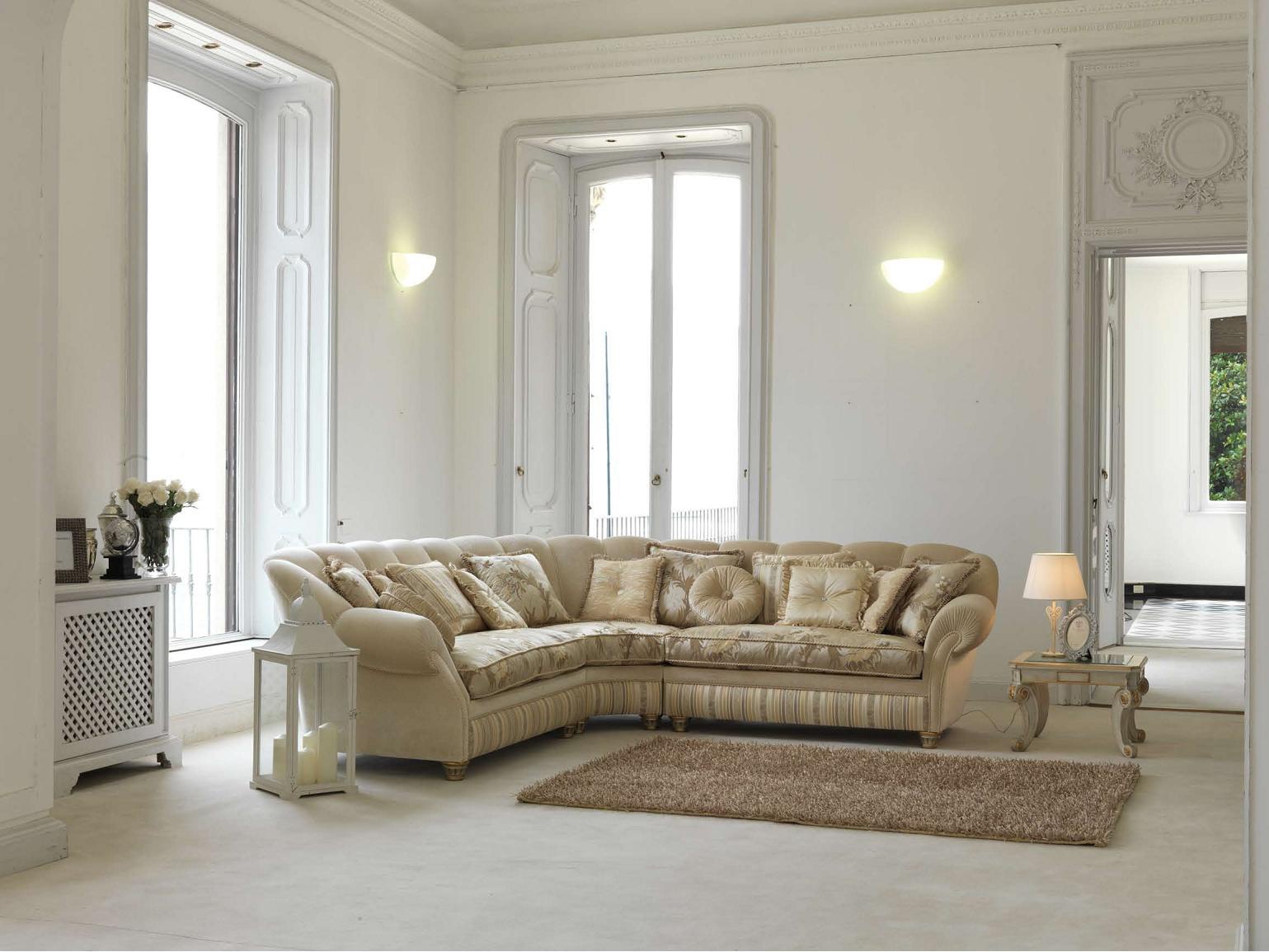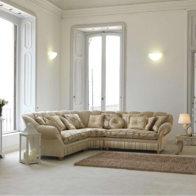 Teseo corner sofa from Italian manufacturer Pigoli. Presents a model of triple corner sofa with soft armrests and backrest. Frame of sofa made of solid wood, upholstery textile. The model is made in classic style.