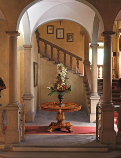 Round table Olimpo from Italian manufacturer Minotti Luigi & Benigno. The model is made in classic style. The table top is made from solid wood and painted with scenes from Roman mythology. Leg massive, carved. The surface is lacquered.