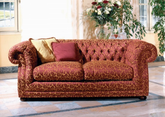 Sofa double'aragona, from the Italian manufacturer TreCi Salotti. The frame is made of wood. Upholstery - textiles from the company portfolio. The armrests are slightly wrapped. The back is decorated with stitch Capito. Colours - Burgundy. The legs are made of wood. Sofa in classic style.