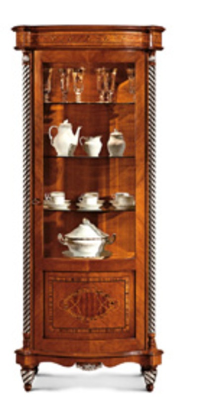 Single door showcase from Italian manufacturer Minotti Luigi & Benigno. The frame is made of solid wood, decorated with carving, with silvering. Glass shelves, interior lights. Panel shutters are decorated with paintings. The model is made in classic style.