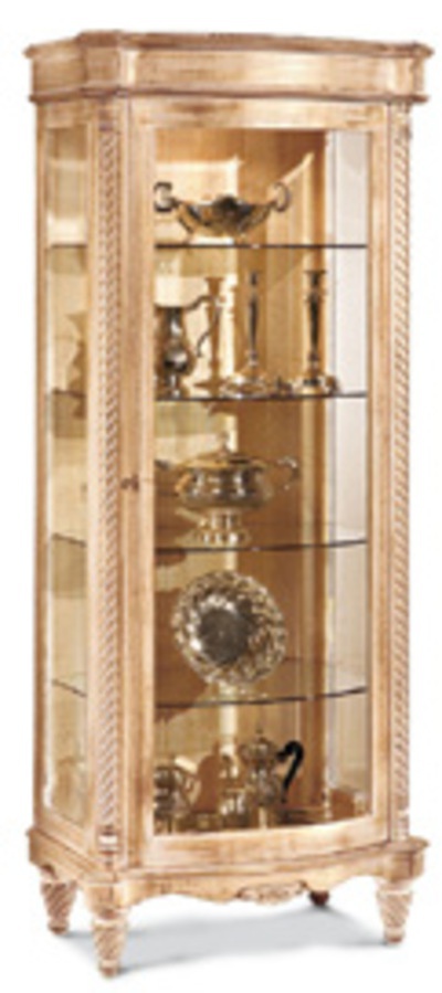 Showcase from Italian manufacturer Minotti Luigi & Benigno. The frame is made of solid wood, decorated with carving, painting gives the effect of aging. Model 1-door, shelves made of glass, internal lighting. The model is made in classic style.