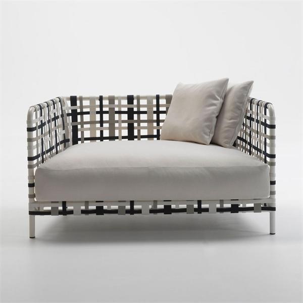 Double sofa Stripes from the Italian manufacturer Bonacina Pierantonio. The model is on a metal frame. There are two versions with high or low backrest covered with ribbons. Upholstery textile to choose from a collection company. Filler - polyurethane foam. In addition offered are decorative pillows of different sizes.