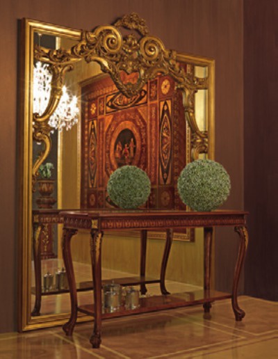 Console with shelf from the Italian manufacturer Minotti Luigi & Benigno. The frame is made of solid wood, decorated with carving, with gold-plated elements. The model is made in classic style.