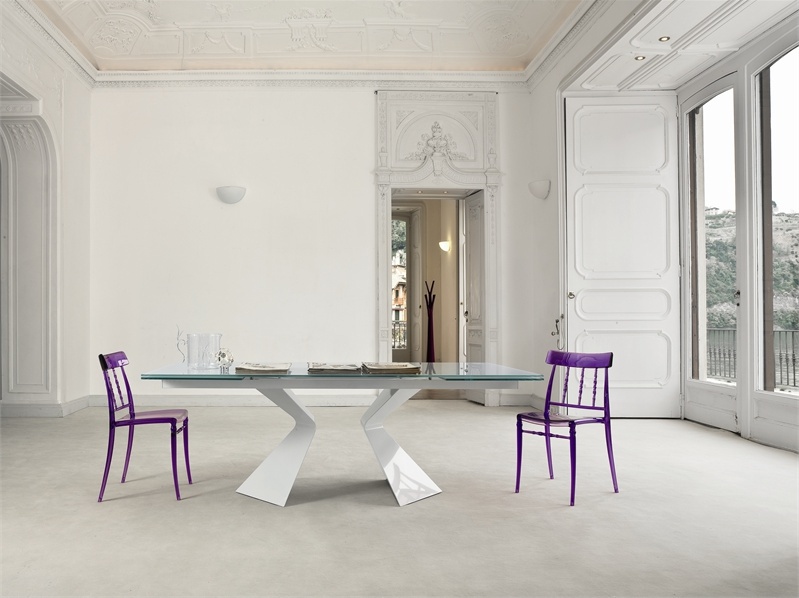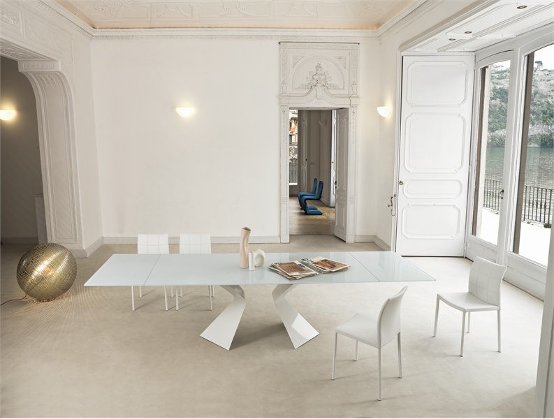 Prora dining table from Italian manufacturer Bonaldo. Model on figured legs of the original design. Material - steel. The surface is painted with high gloss lacquered white or black. Countertop rectangular shapes of glass. The table is manufactured in contemporary style.