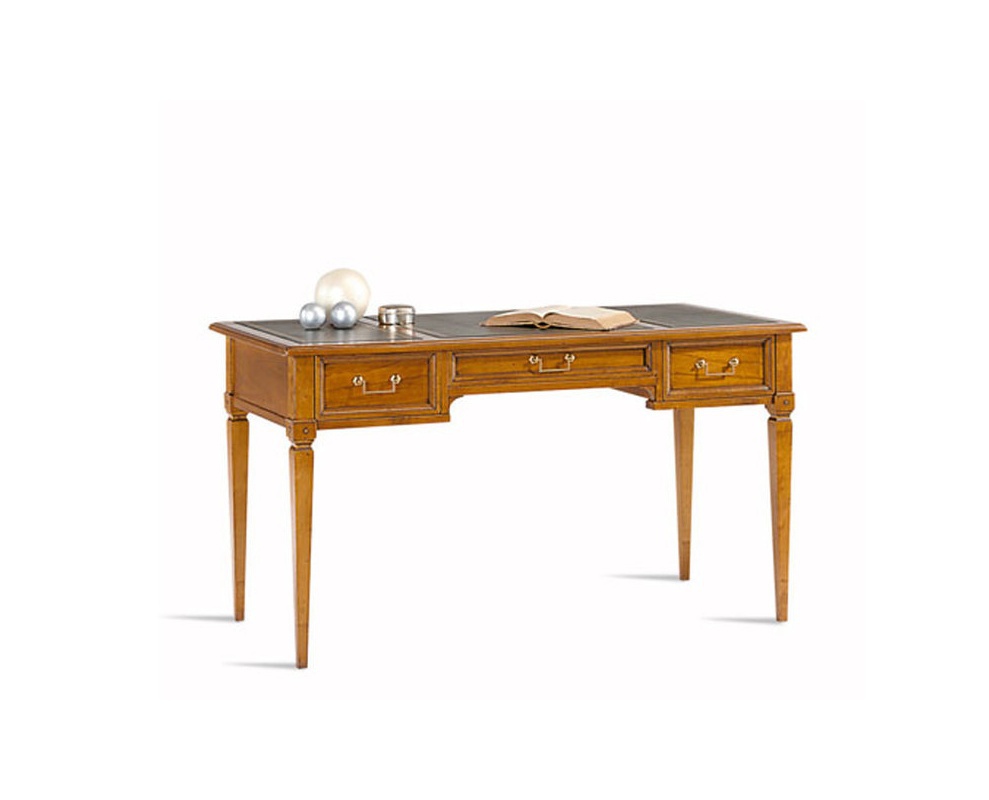 Desk Bellagio from the Italian manufacturer Selva. Table with one large and 2 small drawers. The frame is made from solid beech, the table top and drawers are made from solid Linden and veneer cherry. The table top is decorated with 3 leather inserts. The model is made in classic style.