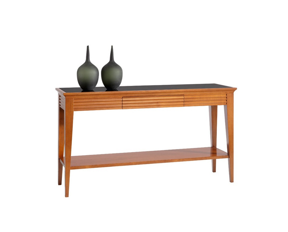 The Luna console in a contemporary style from Italian manufacturer Selva. The legs are made of solid beech. Table top and drawer is made of basswood and are finished with rich cherry. Table top covered with glass.