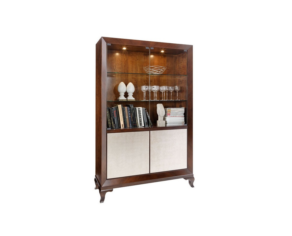 Showcase Tzsar produced by the Italian factory Selva. The Windows frame is made from solid Linden and veneer cherry. Legs made from solid beech. In the upper part with 2 glass doors, 2 adjustable shelves, interior lights. The lower door from veneer wood with leather upholstery. Showcase made in a modern style.