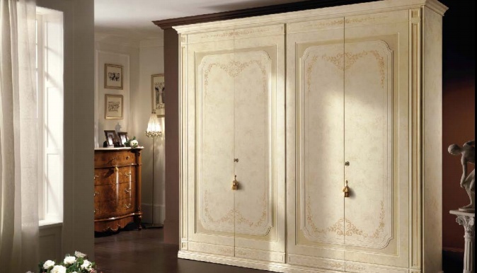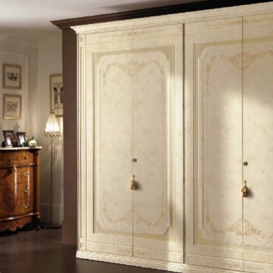 Wardrobe from the Italian manufacturer TreCi Salotti. The frame is made of wood. Finish the wood veneer and Matt varnish from a range of companies. The internal drawers are made of plywood. Color scheme - white. The model is decorated with inlay. The style is classic.
