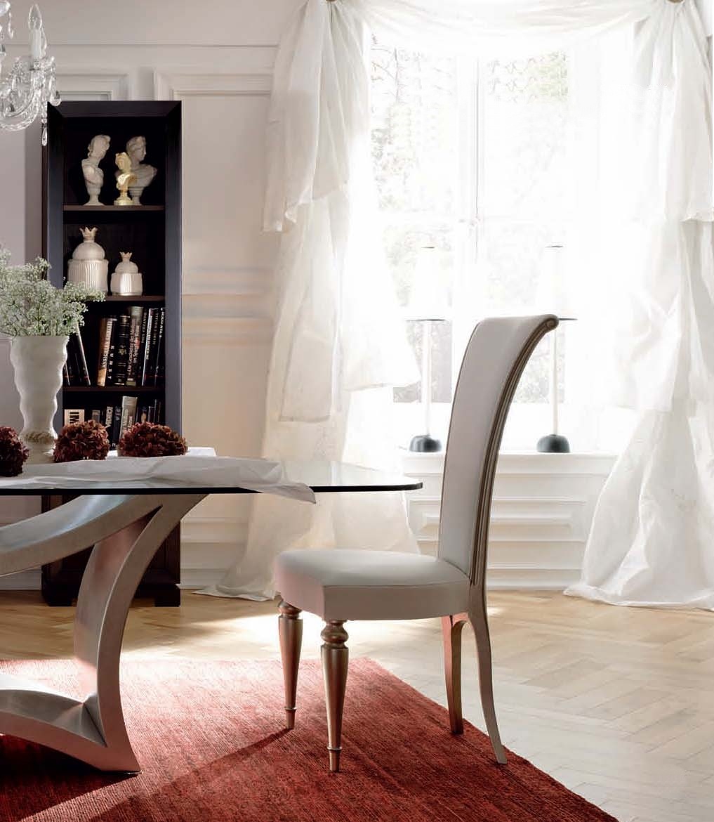 Lara chair with high back from the Italian manufacturer Selva. The frame is made of solid beech. The seat and back are soft. Filler - polyurethane. The upholstery is white leather. Front legs decorated with carvings. The model is made in modern style.
