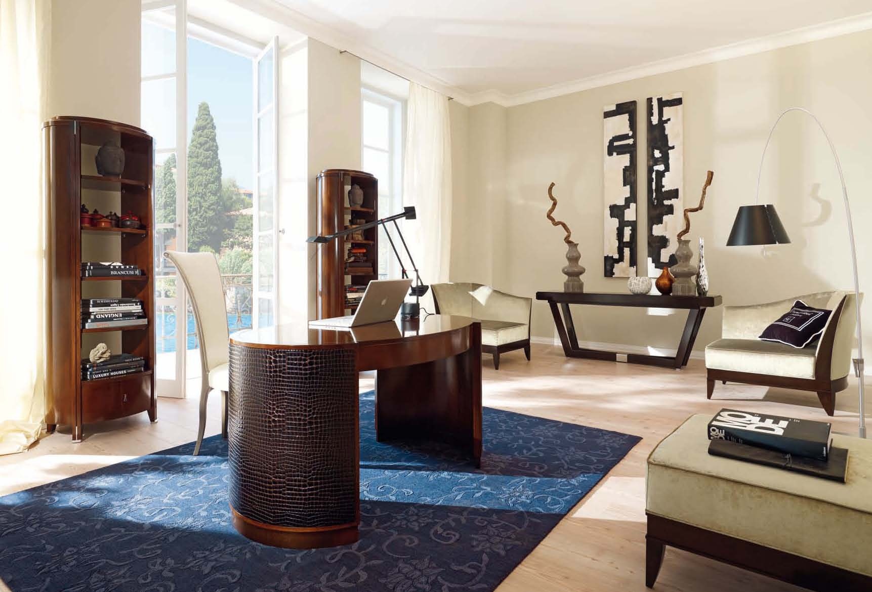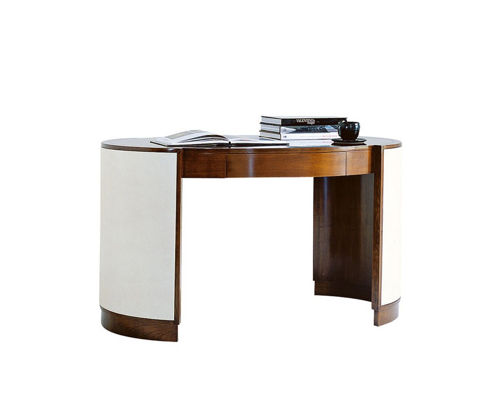 Oval writing Desk Victor from the Italian manufacturer Selva. The frame is made from veneer cherry. The model with one drawer. Side table upholstered in white leather. The table is made in art Deco style.