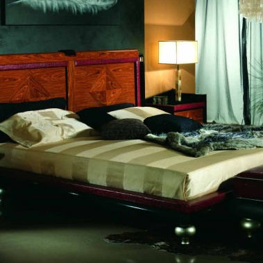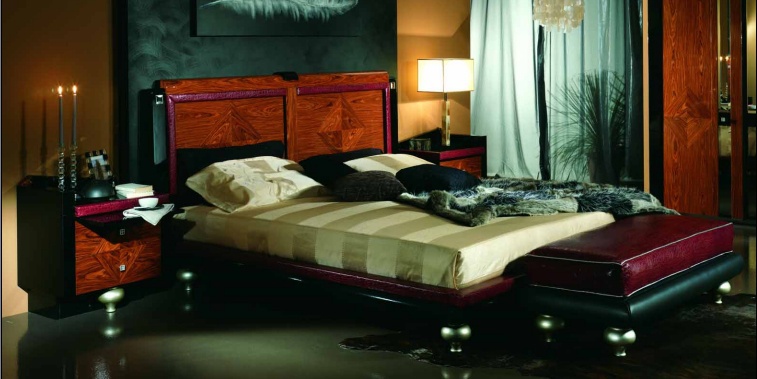 Headsets for bedrooms from Italian manufacturer TreCi Salotti. Includes double bed, two bedside tables and stool. Skeleton models made of solid wood. The color finish is made of wood. Upholstery stools - leather from the company portfolio. Colors - brown, black and red. Set is manufactured in contemporary style.