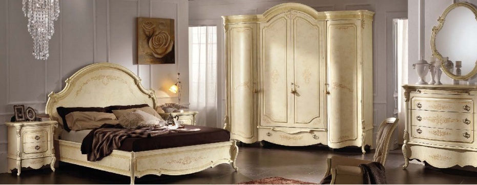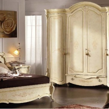 Headsets for bedrooms from Italian manufacturer TreCi Salotti. Includes double bed, two bedside tables, wardrobe and chest of drawers. Skeleton models made of solid wood. The bed is decorated with carved headboard. Fittings - metal. The legs are made in the form of Cabriole. The trim is made of ivory. Set made in a classic style.