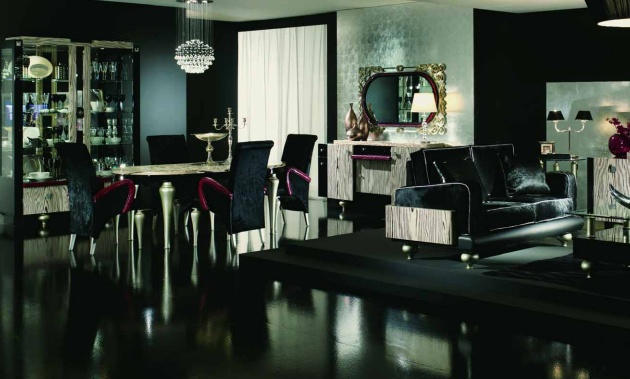Italian dining room set for production TreCi Salotti made of solid wood. Consists of dining table, showcase, cupboard and chairs. Material - solid wood. Shelves and doors Windows are made of transparent glass. The frame and legs lacquered. Upholstery textile from the company portfolio. Colors - black, white and Burgundy. Set is made in modern style.