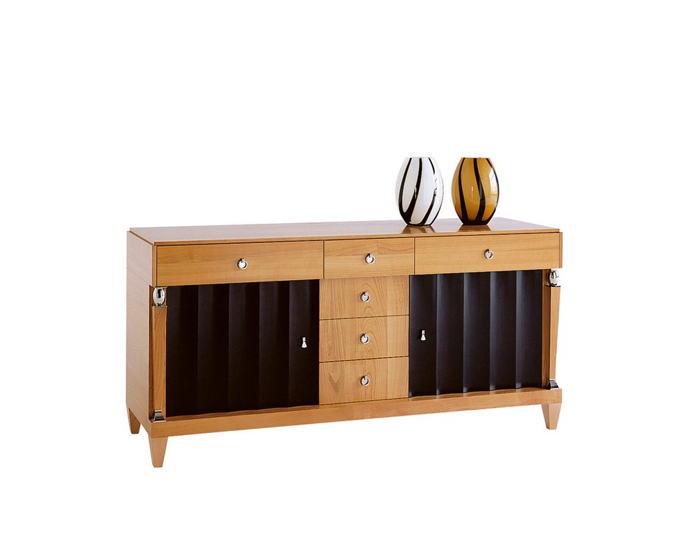 The Heritage J. S. chest of drawers from Italian manufacturer Selva. The frame is made of solid alder, finished with rich cherry. Model for small feet made of solid beech wood, with six drawers, the doors with wavy surface. The drawers are decorated with metallic accents in silver color. Made in a modern style.