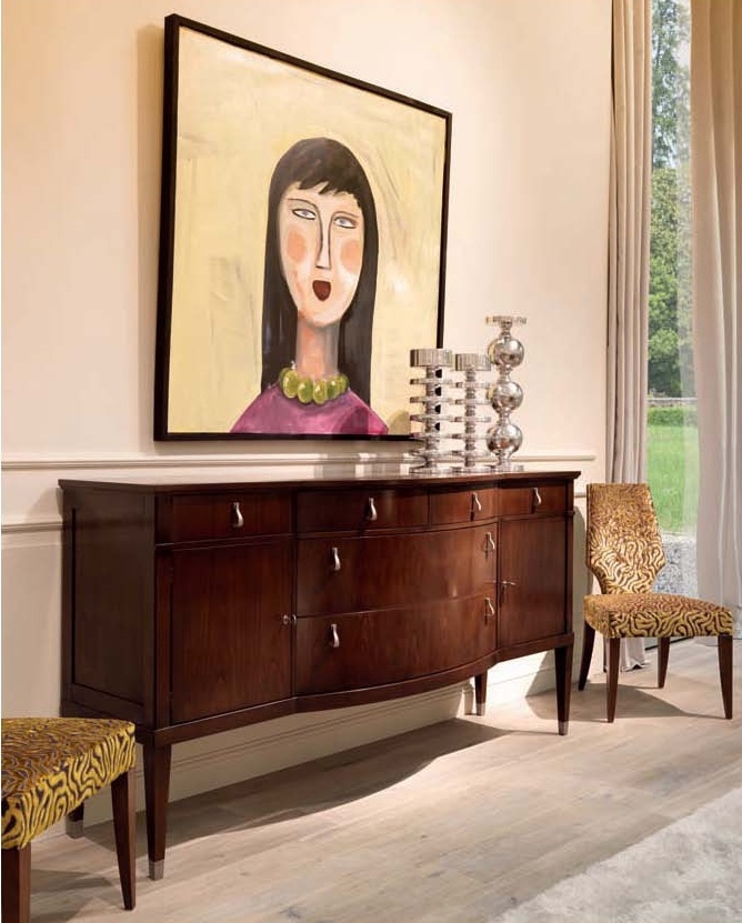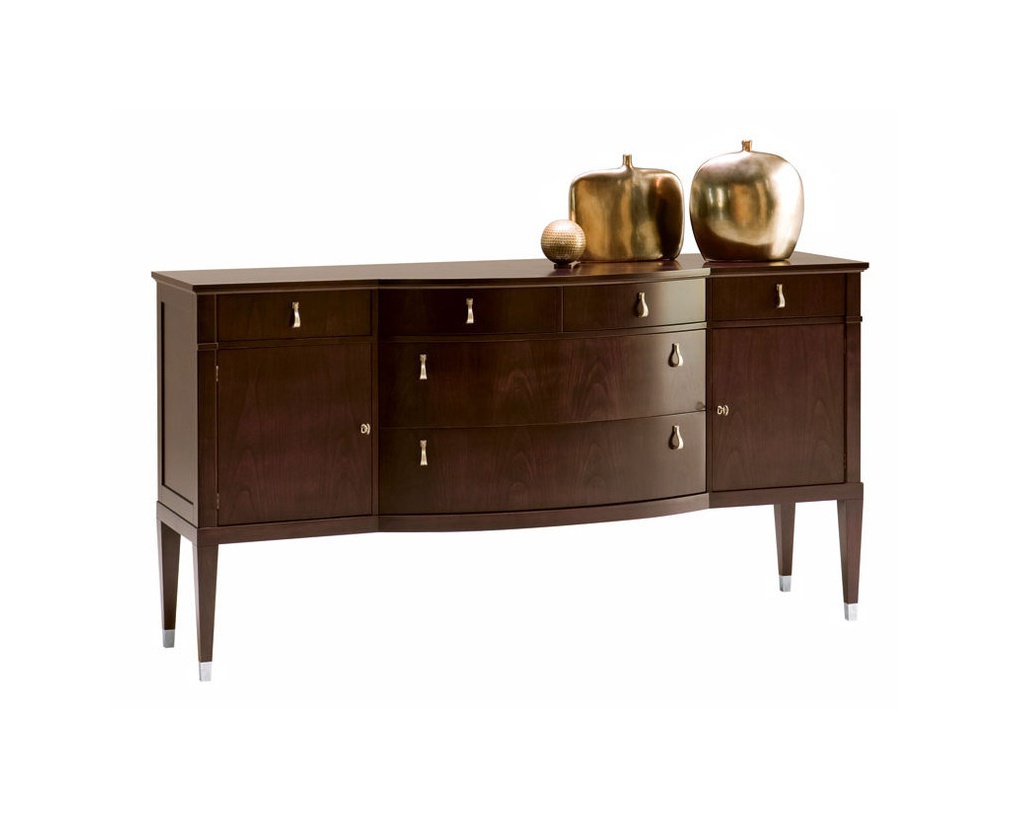 A chest of drawers on high legs Rubens production Selva. The frame is made of solid alder, finished with veneer of cherry. Chest with two large and four small drawers. Two doors burrow a key. Metal inserts on the legs and fittings in silver color. The model is made in modern style.