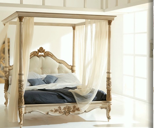 Double bed from Italian producer Silvano Grifoni. Bed frame made from solid wood and the headboard is made of textile. The color of this model, the bed - light. Bed enriched with carved four-poster bed.