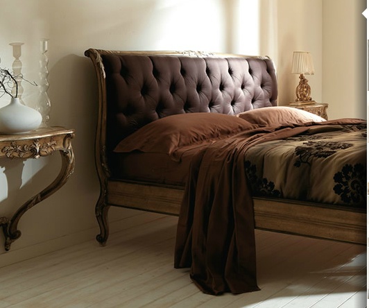 Double bed from Italian producer Silvano Grifoni. Bed frame made from solid wood and the headboard is made of textile. Agolove decorated with stitch Capito. The legs are made in the form of Cabriole. The color of this model bed - brown.