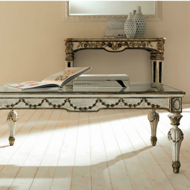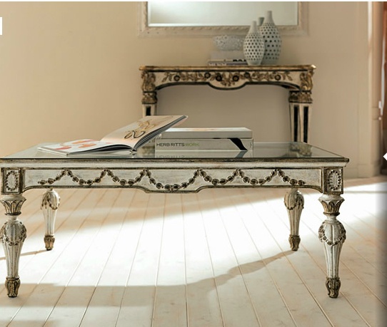 Coffee table from Italian producer Silvano Grifoni. The frame is made from solid wood. Tabletop - strong glass. The frame is enriched with carved elements, and antique finishes. The style is classic.