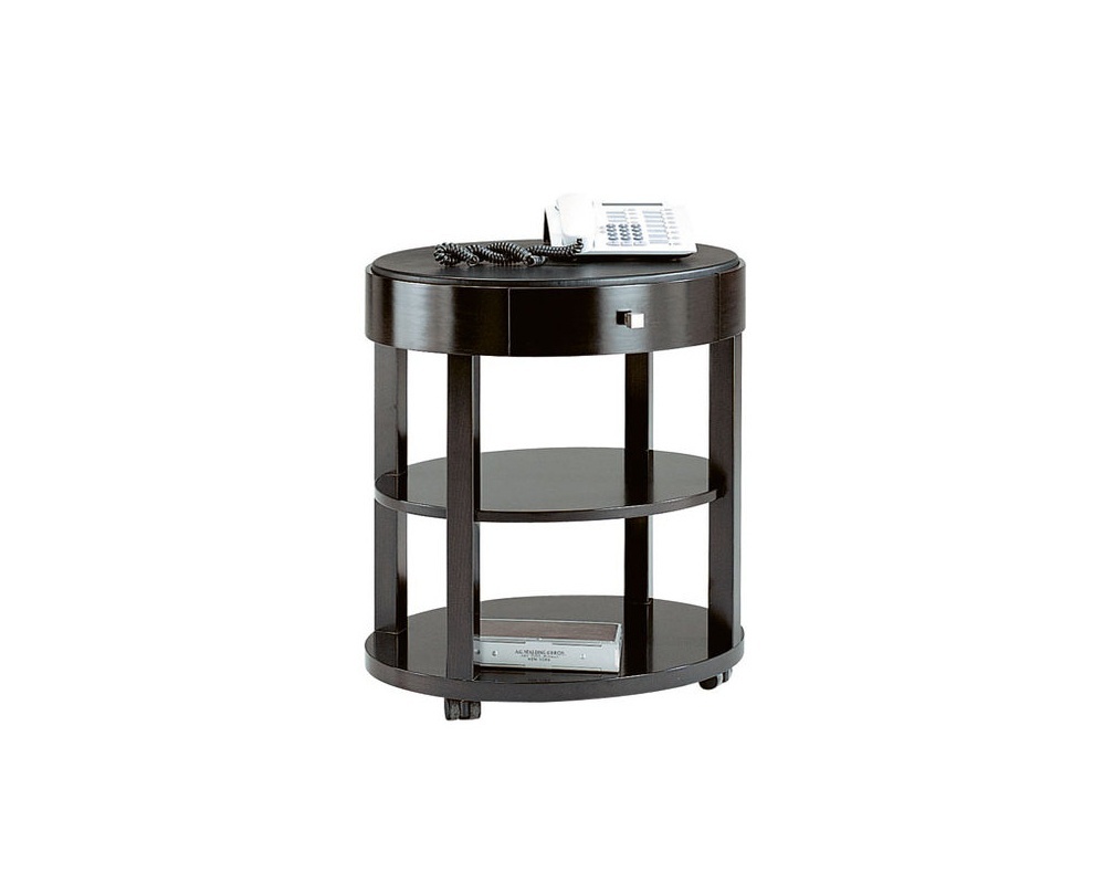 Oval stand on wheels production of the Italian factory Selva. Frame is varnished, made of solid wood, veneer of cherry. The table top is covered in black leather. Stand with one self-closing drawer and two shelves. The model is made in modern style.