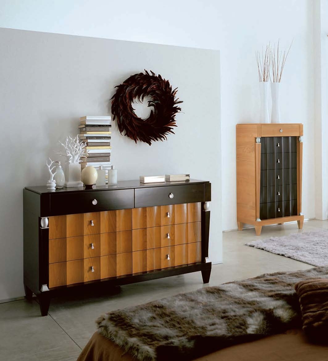 The Heritage J. S. chest of drawers produced by the Italian factory Selva. Legs made from solid beech, the frame is made of solid alder, finished with rich cherry. A simple model with two drawers and six drawers with wavy panels on self-closing mechanism. The drawers are decorated with metallic accents in silver color. The model is stylized in the art Deco style.