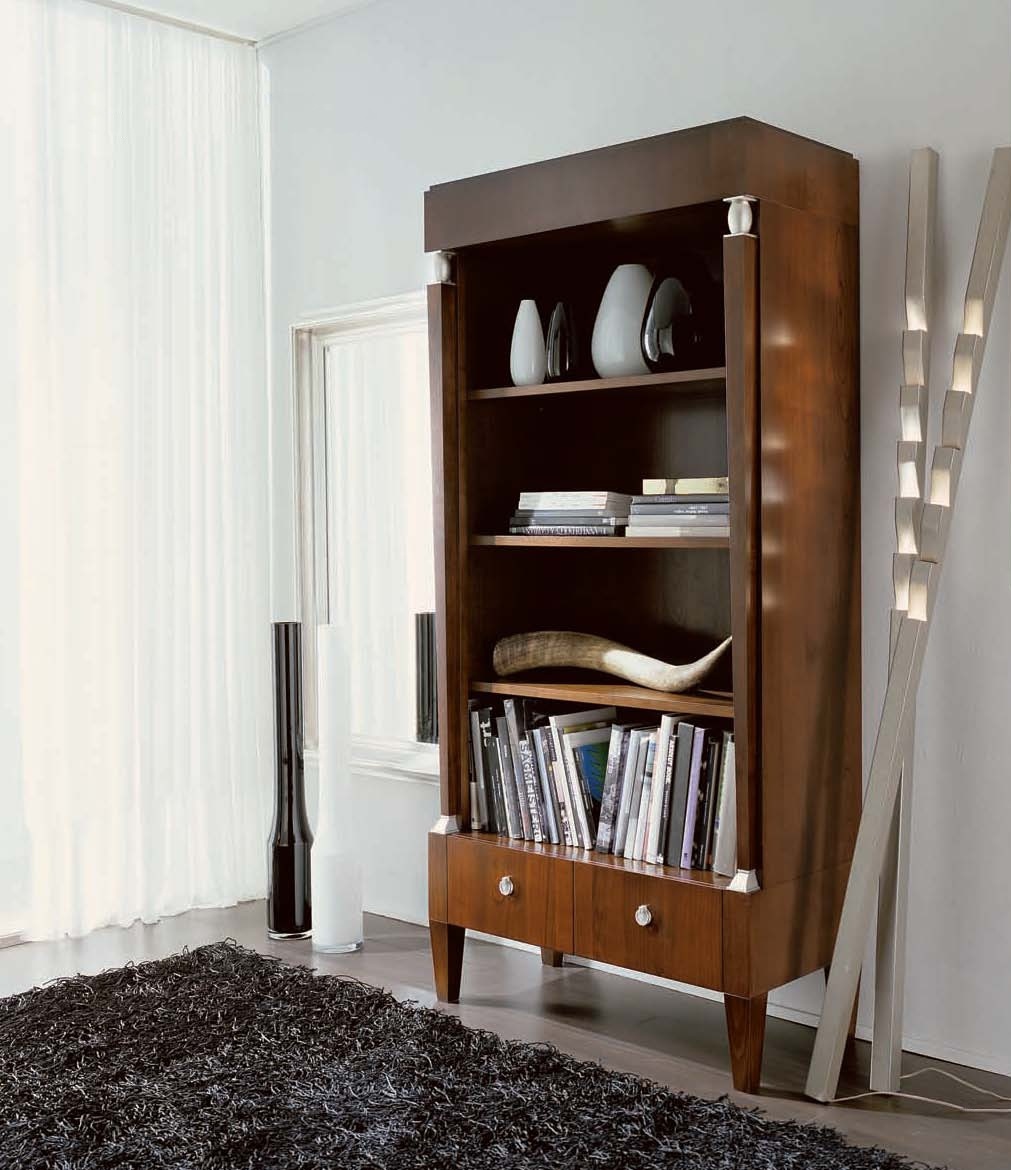Bookcase production Selva. Cabinet on legs, made of solid beech wood. Frame and three removable shelves made of solid alder, finished with rich cherry. At the bottom of the Cabinet with two self-closing drawers. The model is decorated with metal inserts, made in a modern style.