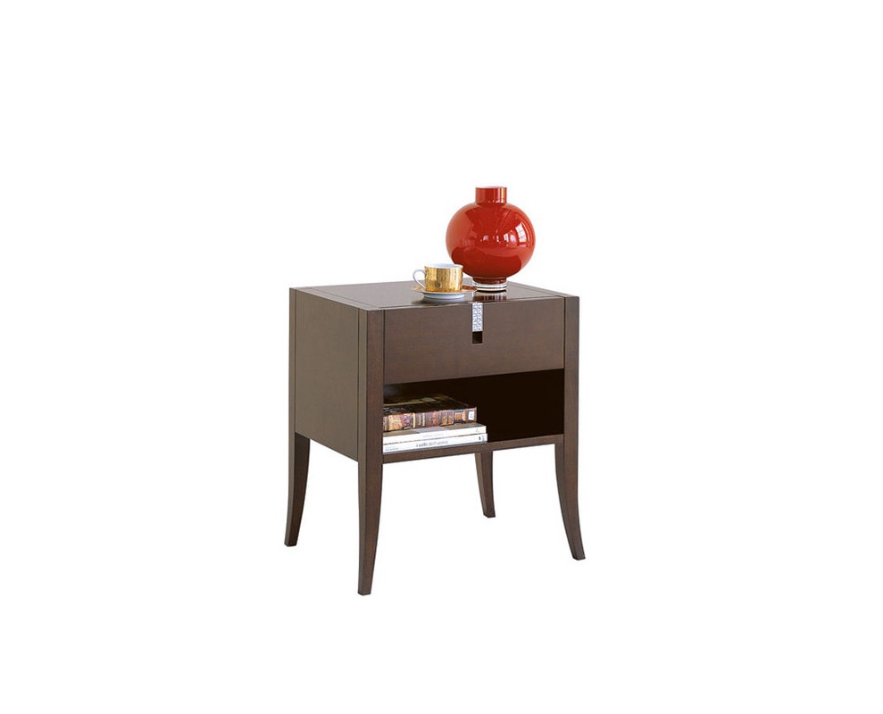 Bedside table Solitaire the production of Selva. The model with one drawer and open niche. The frame is made from solid beech, the table top and drawer are finished with rich cherry. The drawer insert is decorated with Swarovski crystals. There are other options of scenery. The model is made in modern style.