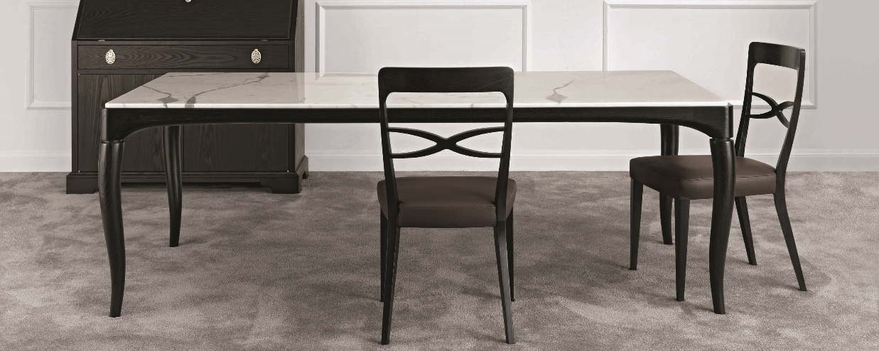 Tino dining table from Italian producer Galimberti Nino. Model on high legs, curly shape. Material - solid ash or American walnut. Rectangular top is made of glass or marble. The finish is offered under the color of natural wood.