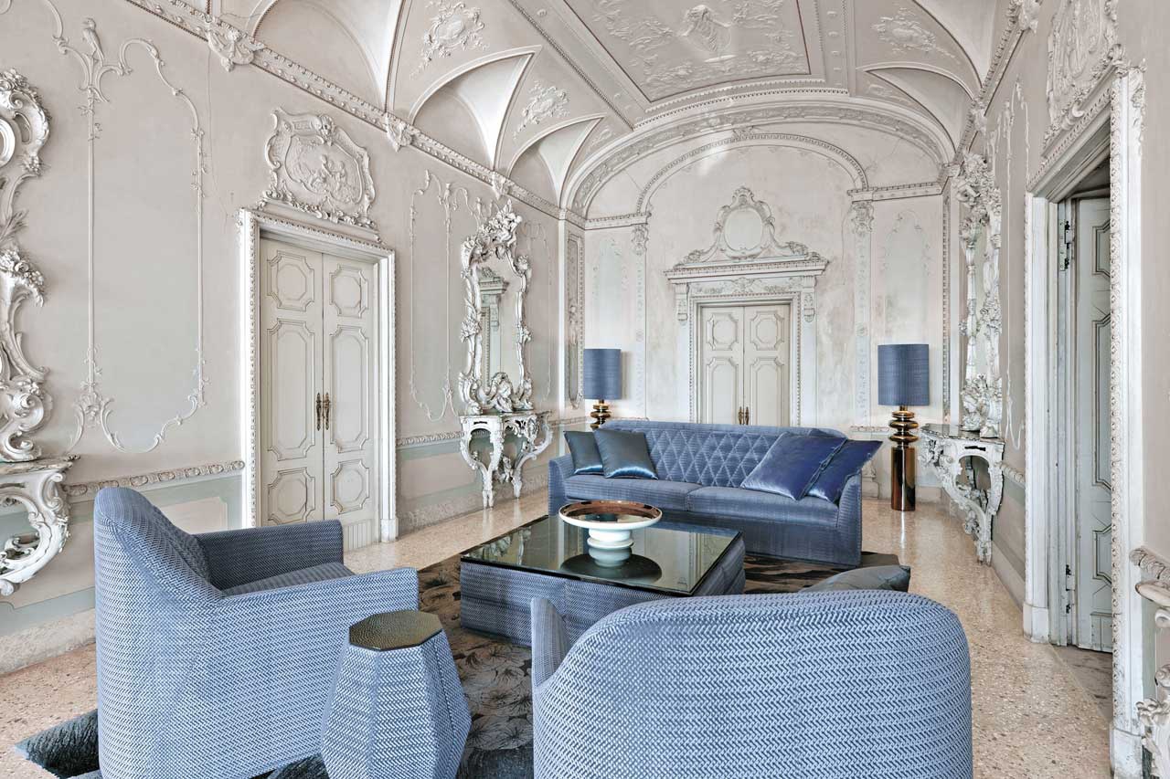 Sofa set from the Italian manufacturer Smania. Includes a double sofa bed, armchairs and a coffee table. Model on a frame of solid wood. The upholstery is made of textile. The table top is made of glass. Decoration are ornamental pillows and stitch Capito. Headsets are made in a modern style.