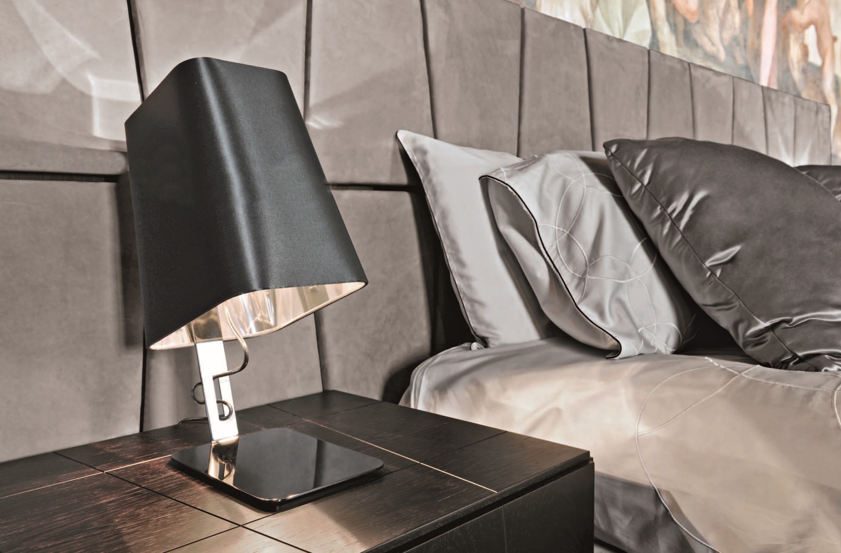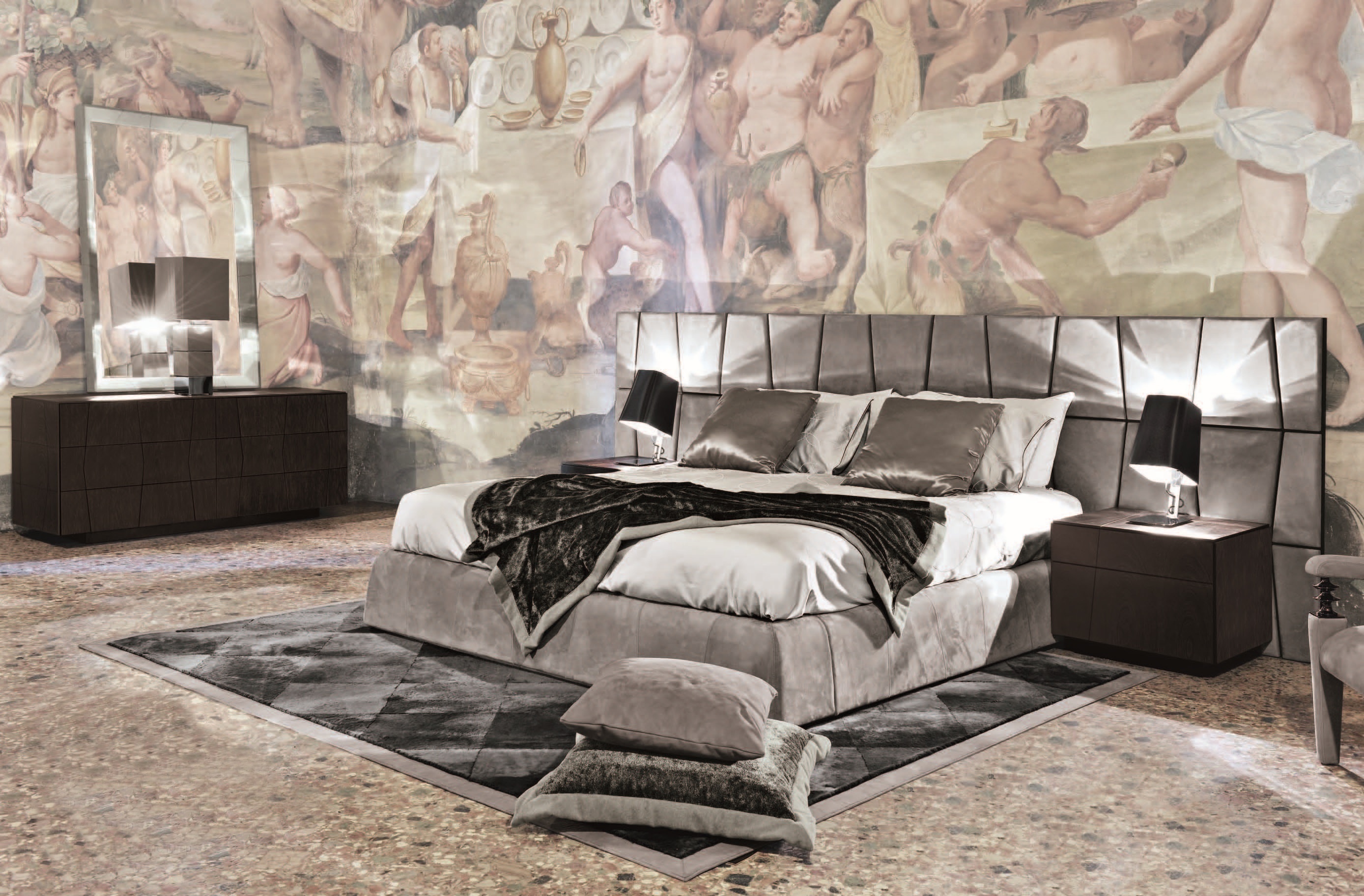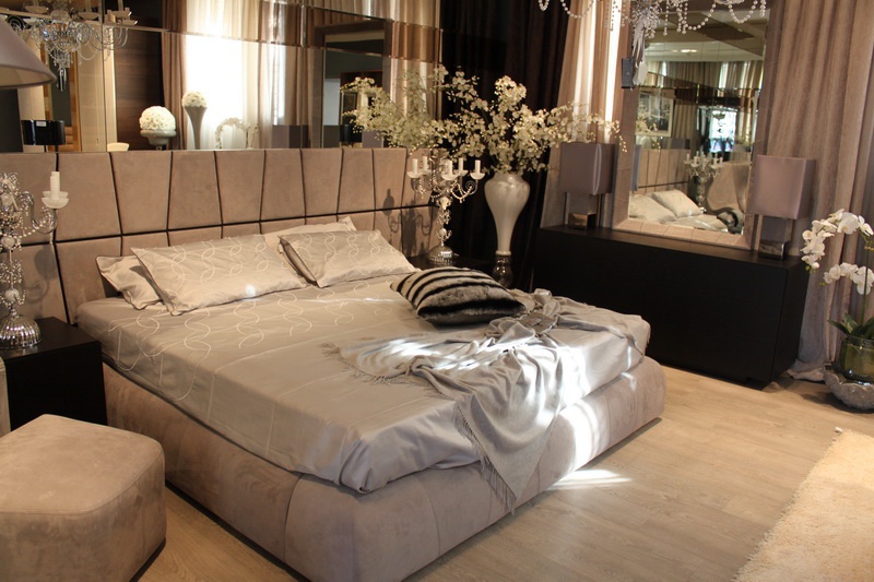 Double bed with high headboard and wide Colorado from the Italian manufacturer Smania. The model is made in a modern style with soft headboard. The frame is made of wood. For upholstery, use leather or textiles. Colours in stock.
