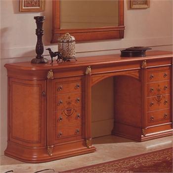 Coqueta California vanity from Italian manufacturer Vicente Zaragoza. The frame is made from solid beech and maple, the surface is treated with varnish from the range of the campaign. The handmade decor. The model is decorated with inlay. Carved details, finished off in gold leaf. Table with drawers and hinged doors. A great choice for bedrooms in classic style. Product color natural wood.