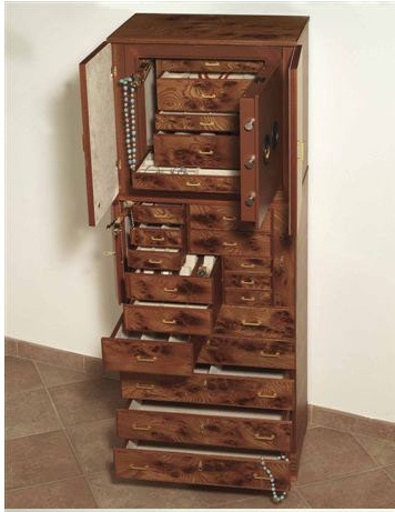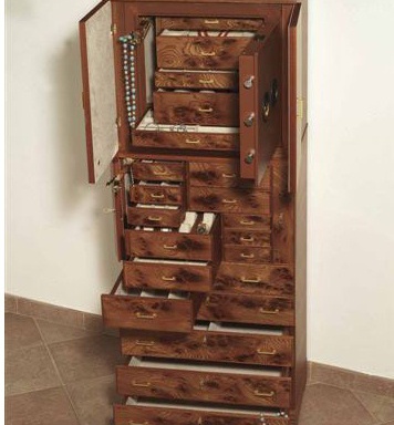 Dresser for jewelry, from the Italian manufacturer Agresti. The frame is made from solid wood. Finishing varnish from the company portfolio. The model contains a number of different boxes, which differ in functionality. The drawers complemented by a safe with drawers.
