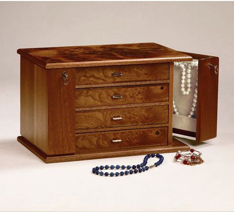 Dresser for jewelry, from the Italian manufacturer Agresti. The frame is made from solid wood. The chest consists of various boxes with metal fittings. Two sections can be locked for safe storage of jewelry. Colors - brown.