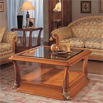 Table mesita California from Italian manufacturer Vicente Zaragoza. The frame is made from solid beech and maple wood, surface treated with glossy varnish. The top glass. The handmade decor. Carved details, finished off in gold leaf. The model is decorated with inlay. Coffee table, square shape. A great choice for the living room in a classic style. Product color natural wood.
