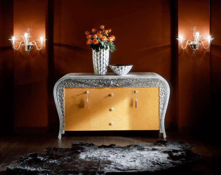 Canteen, from Italian manufacturer Cl Italia. The frame is made from solid wood. Finishing varnish from the company portfolio. Colors - brown and silver. The snack bar consists of three sections. Average - drawers. The tabletop is decorated with carved decoration. The model is made in fusion style.