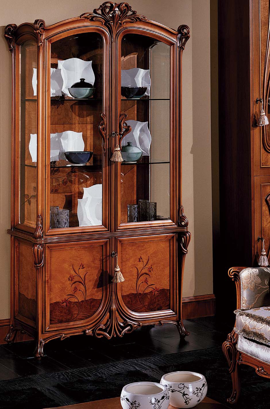 Showcase, from the Italian manufacturer Cl Italia. The frame is made from solid wood. The facade is decorated with inlaid and carved elements. Doors and shelves are made of glass. Metallic accessories complemented with textile tassels.