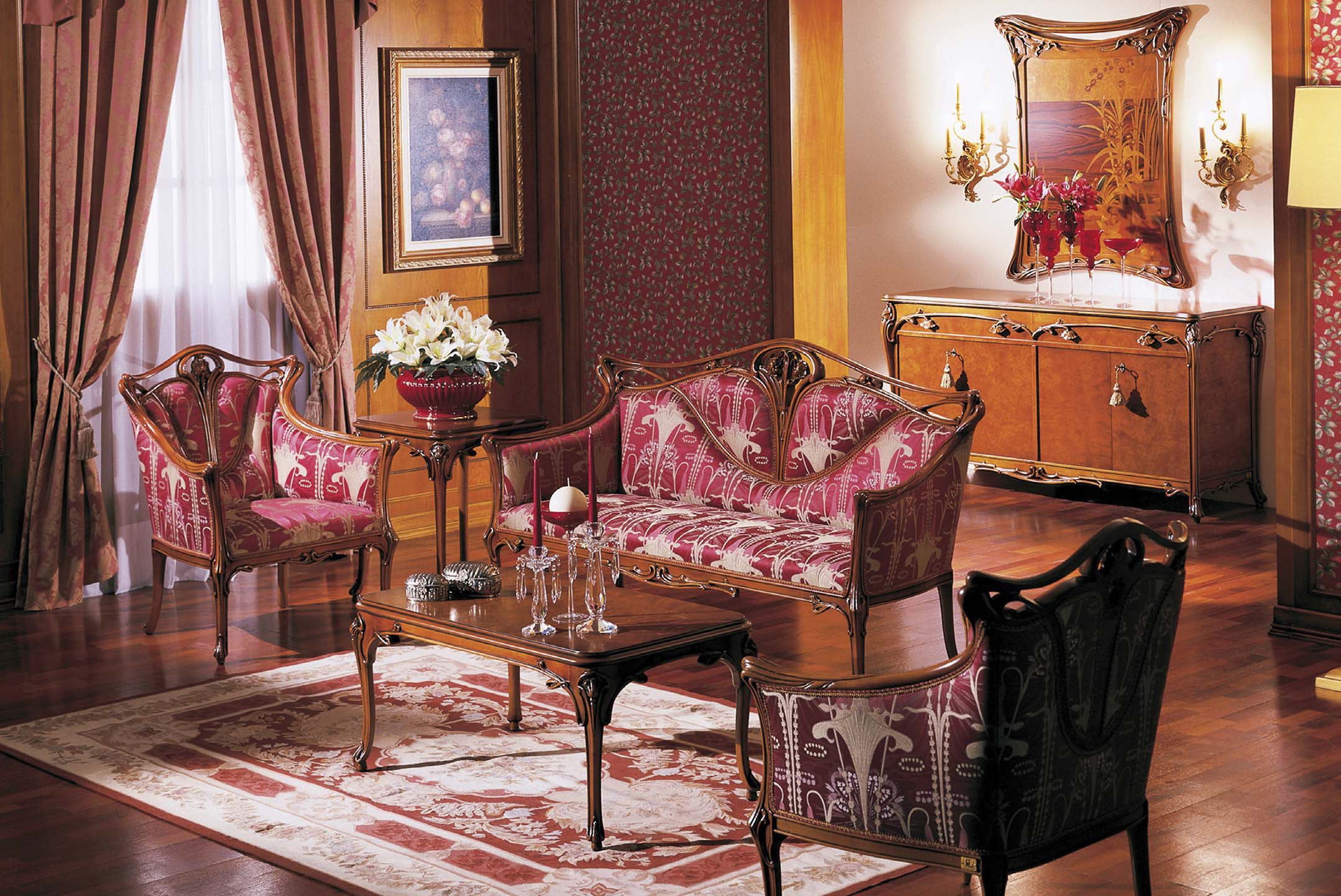 Sofa set from the Italian manufacturer CL Italia. Includes double sofa, armchairs and coffee table. Model on a frame of solid wood. The upholstery is made of textile. The table top is made from wood and a high gloss finish. Decoration are carved decor. Set made in a classic style.