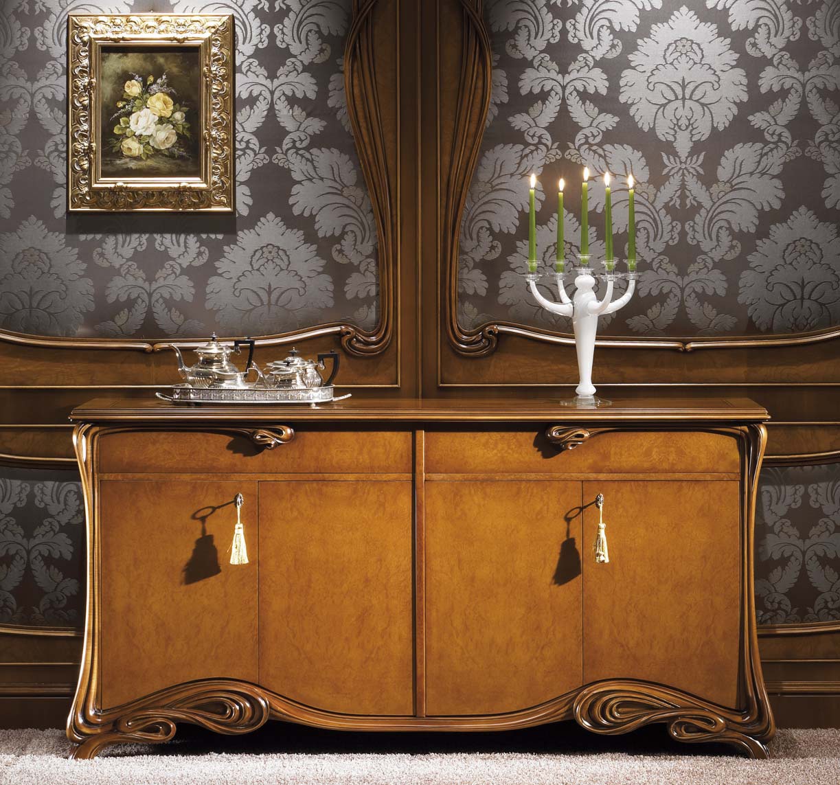Canteen, from Italian manufacturer Cl Italia. The frame is made of wood. Finish - lacquer and carved decor. Colors - brown. The model is made in the liberty style. Pen complemented with textile tassels.