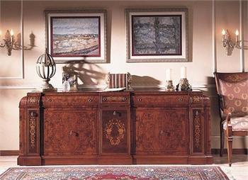 The Viena aparador chest of drawers from Italian manufacturer Vicente Zaragoza. The frame is made from solid wood, finishing in spanam tree. Accessories - bronze. Decoration - marquetry/inlay. Details accented with gold leaf. Model with closed sections for storage and drawers. The chest is designed for the living room in a classic style. Product color natural wood.