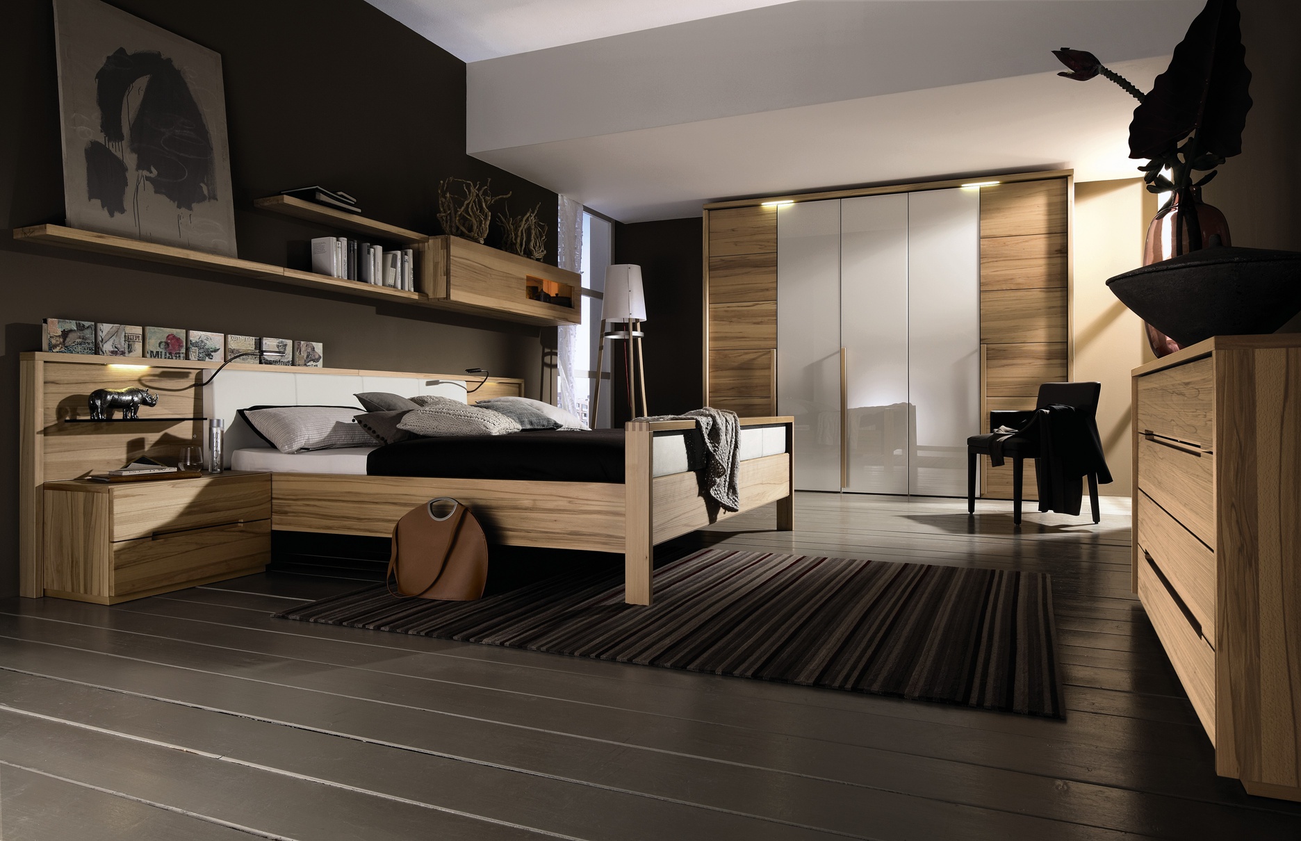 Set for bedroom bedroom Acrea from Hulsta German manufacturer. Includes double bed, two bedside tables, chest of drawers and wardrobe. Frames made of solid wood. Finish option to choose from a range of companies. The headboard is covered in black leather. Models can be equipped with built-in lighting.