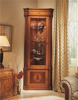 Showcase Viena from the Italian manufacturer Vicente Zaragoza. The frame is made from solid maple, finish spanam tree. Door and shelves - glass. Details accented with gold leaf. Decoration - marquetry/inlay. All stages of the finishing is done by hand. Angular model with built-in illumination. A pretty choice for interiors in classical style. Product color natural wood.
