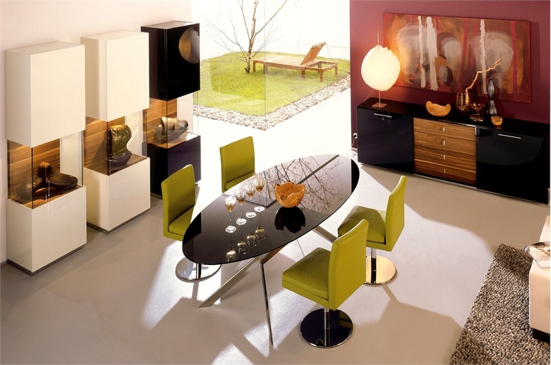 Dining table from the German manufacturer Hulsta. Model on figured legs in chromed metal. The table top is rectangular. Material - wood or glass. Finish offered a choice from a range of companies. Is a modern design, durability and elegance.