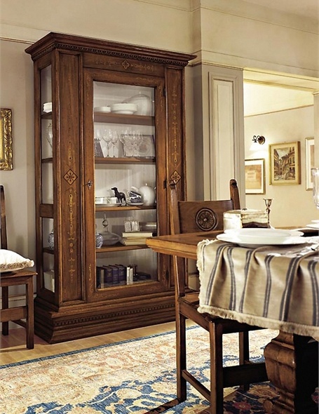 Showcase from the Italian manufacturer Zilio. Single model on the carved frame of solid wood. Doors - glass. The surface is treated with varnish from the range of the campaign. A chic choice for the dining room in a classic style. Product color natural wood.