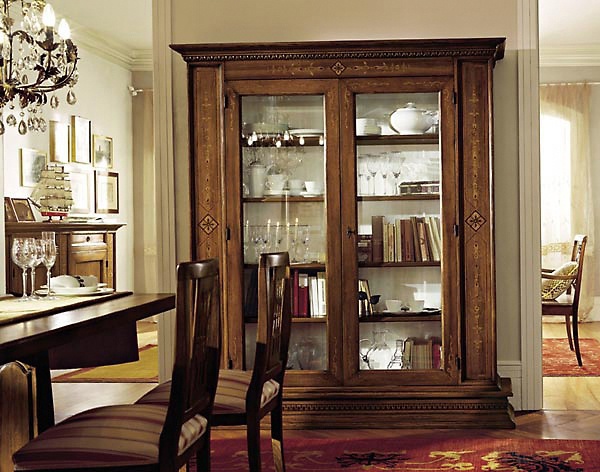 Showcase from the Italian manufacturer Zilio. Double model on the carved frame of solid wood. The surface is treated with varnish from the range of the campaign. Doors - glass. Showcase decorated with intarsia. A wonderful choice for the dining room in a classic style. Product color natural wood.
