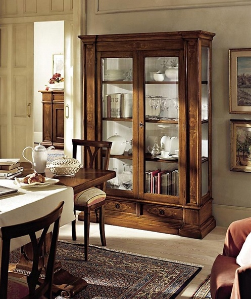 Showcase from the Italian manufacturer Zilio. A two-leaf model is made of solid wood. Doors - glass. The surface is treated with varnish from the range of the campaign. Showcase with drawers is decorated with intarsia. Excellent choice for a dining room in classical style. Product color natural wood.
