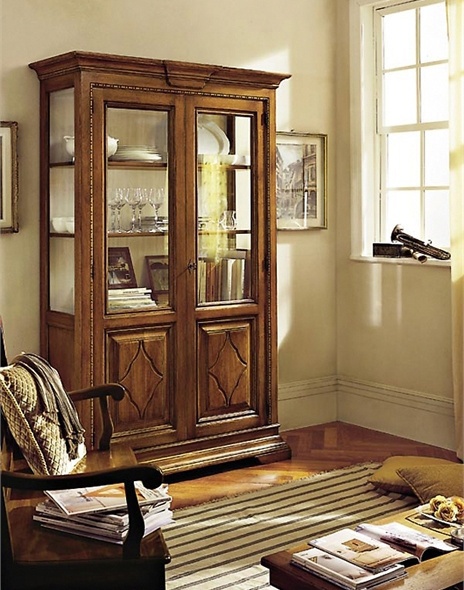 Showcase from the Italian manufacturer Zilio. Double model on a frame of solid wood. Doors - glass. The surface is treated with varnish from the range of the campaign. Showcase decorated with carved decoration. A pretty choice for interiors in classical style. Product color natural wood.
