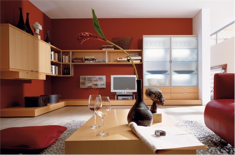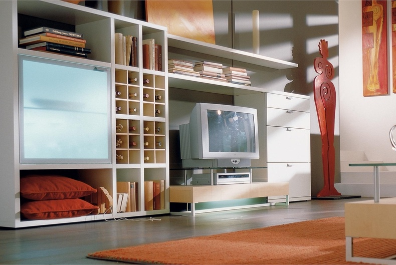 Modular system Tameta tv unit from German manufacturer Hulsta. Consists of open shelves, cabinets with hinged doors and drawers. Material array. The finish is offered under the color of natural wood or glossy lacquer. Fold two kinds of deaf and glass. The metal fittings. The model is equipped with a silent system of opening.