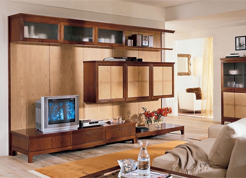 Modular storage system from Italian manufacturer Zilio. The frame is made from solid wood. Sash - blind/glass. The facade of the Cabinet is decorated with intarsia. Wall for books and TV. A perfect choice for a living room in classic style. Colors: light natural wood color.