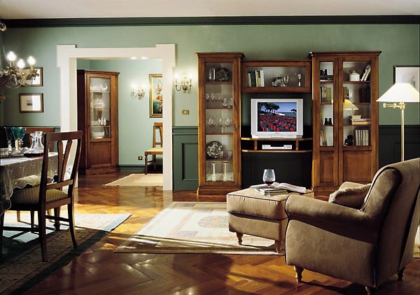Modular storage system from Italian manufacturer Zilio. The frame is made from solid wood, the surface is treated with varnish from the range of the campaign. Sash - blind/glass. Wall for books and TV. A chic choice for the living room in a classic style. Product color natural wood.
