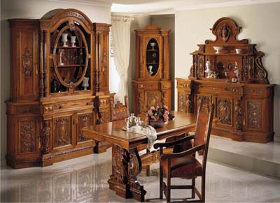 Set for the dining room from Italian manufacturer Bezziccheri. Includes cupboard with blind doors, showcase, chest of drawers, rectangular table and chairs. Frames models made from solid wood. The finish offers a glossy lacquer or veneer. Upholstery choice of leather or textiles from a range of firms. Decoration is the decorative carving handmade.