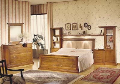 Headsets for bedrooms from Italian manufacturer Bezziccheri. Consists of double bed, drawers and a system of lockers and open shelves. The frames are made of solid. The finish is offered under the color of natural wood. High headboard covered with white textiles. In addition, it is proposed with built-in backlight.